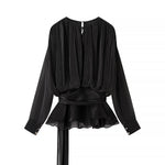 Luźniejsza góra z długim rękawem zapewnia komfort noszenia oraz swobodę ruchów, jednocześnie prezentując się niezwykle stylowo. Delikatne marszczenia oraz lekki materiał nadają bluzce eleganckiego i subtelnego wyglądu. Wiązanie w talii pozwala na indywidualne dopasowanie, podkreślając sylwetkę i tworząc proporcjonalną linię. Dzięki temu bluzka świetnie komponuje się zarówno ze spodniami, jak i spódnicami.